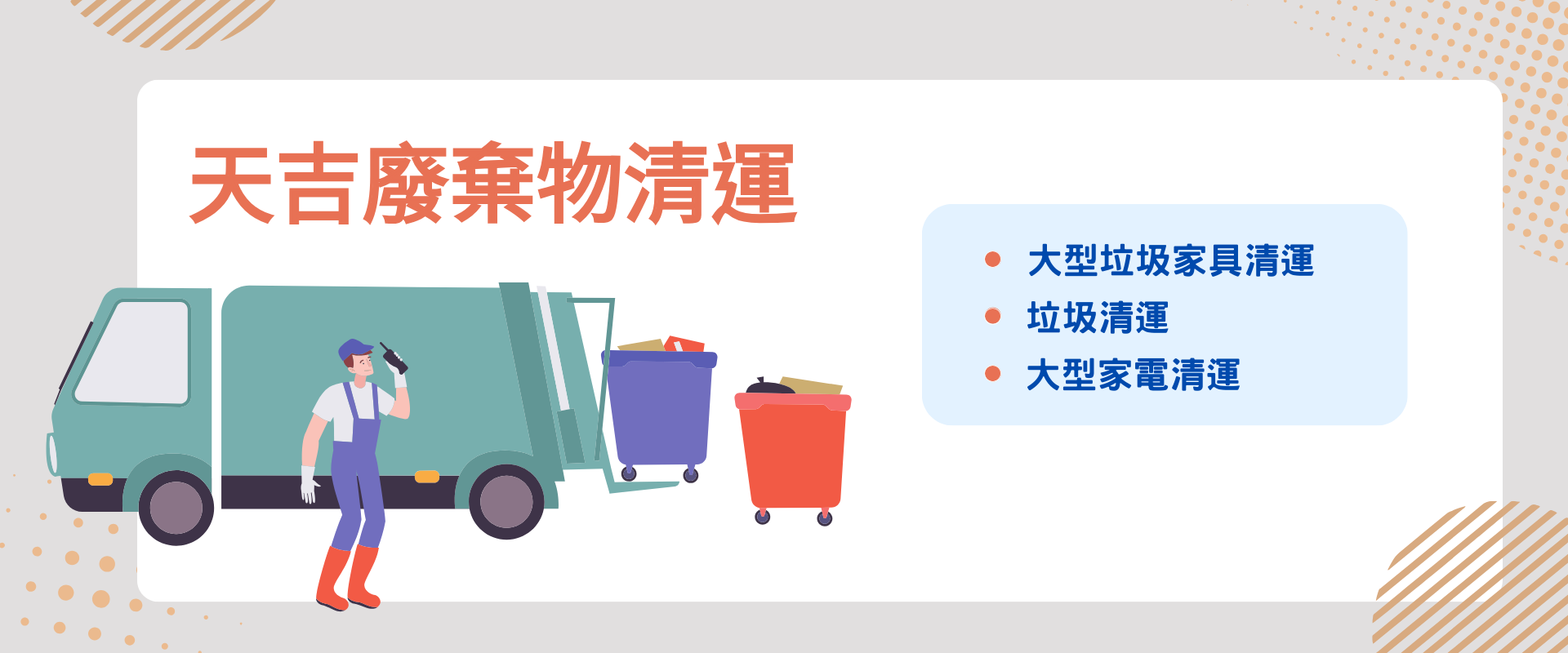 隨著城市人口增加和經濟發展,廢棄物產生量也持續上升。新竹【天吉廢棄物清運】提供有效且環保的廢棄物清運服務,對於大型垃圾、家具、廢棄物、家電都有專人可處理,任何想要請專人清運的物品,天吉團隊都能妥善為您處理,不管是住家、公司、工廠或學校,只要有廢棄物清運的相關需求,歡迎與我們透過電話或LINE免費諮詢,將有專人為您服務!